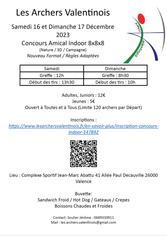 C'est avec plaisir que nous vous convions à un concours en salle Amical d'un format un peu particulier, Samedi 16 et dimanche 17 Décembre 2023 dans notre complexe multisport J-M Abattu de Valence.